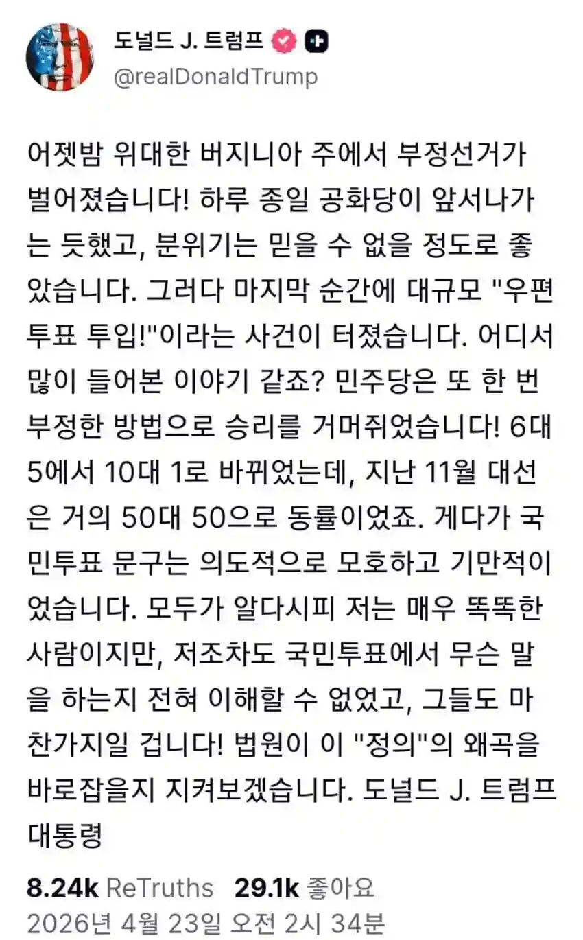 트람프: 버지니아 선거 인정할수 없어!