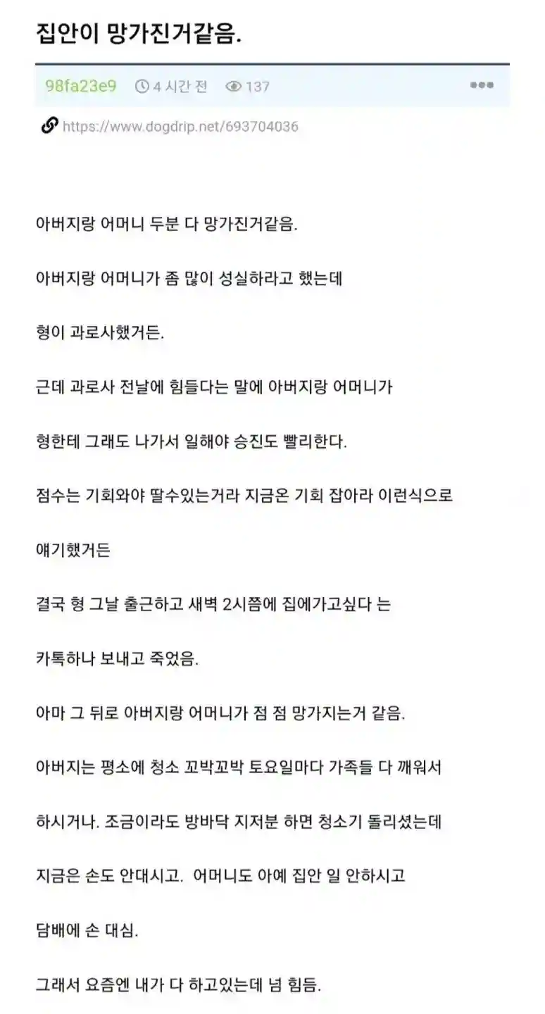 형이 과로사하고 집안이 망가진 거 같음N